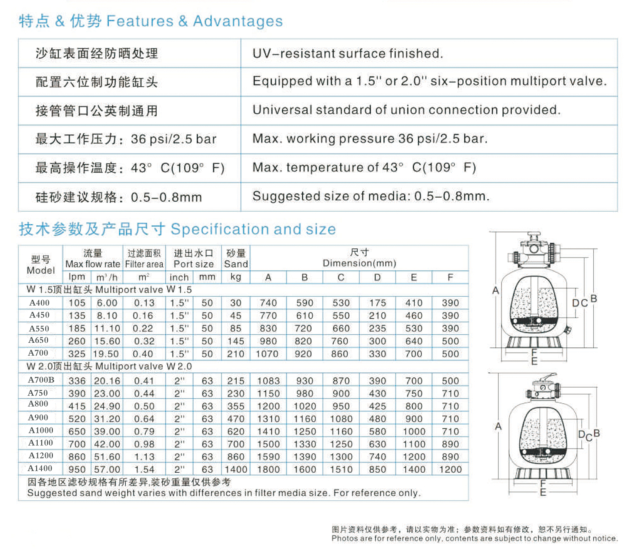 A400 Manufacturer Direct Supply Swimming Pool Fiberglass Top Mount Sand Filter Tank is made of high quality fiberglass and resin, the fiberglass winding structure makes the sand filter more stronger, there is UV - resistant on the surface, the whole filter has good resistance to chemical and sun protection. The A series bobbin - wound fiberglass top mount filter is the first choice for water treatment equipment at swimming pools, hot springs, spas, aquariums and water parks etc.